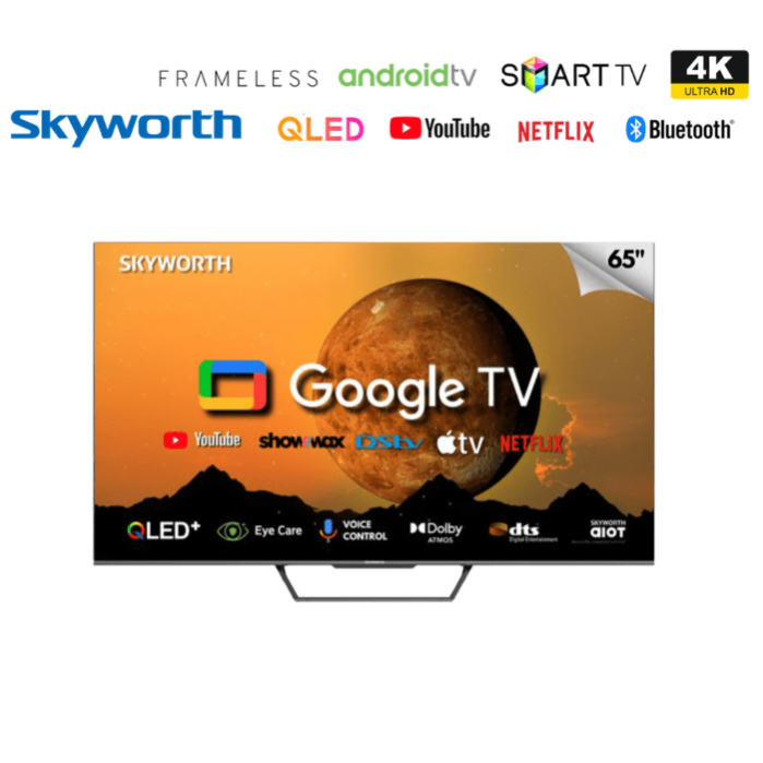 SKYWORTH 65SUE9500 65" offers in Full Screen with Google TV OS QLED 4K UHD Dolby Vision & HDR 10+, Google Assistant, Google Far field voice control, Dolby Atmos for TV, Bluetooth 5.1, Picture quality tuning, Chameleon Extreme 2.0 Processor, Health Platform, Google Play Store, Netflix, YouTube, Shahid, Prime, Chromecast built-in, Game Mode, Storage 16GB, RAM 2GB, HDMI*3, USB*2.