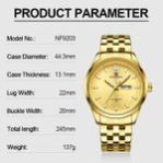 Brand:Naviforce Date and Day calendar display Band Material;Stainless Steel Water Resistance;30M Band Length;22.5cm Case Thickness;14mm Dial Diameter;43mm