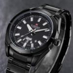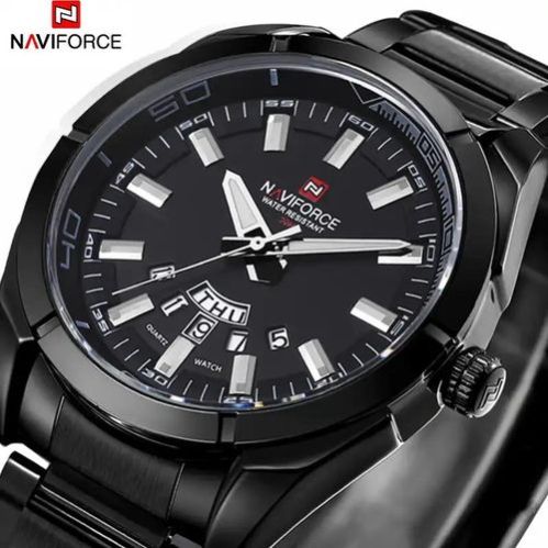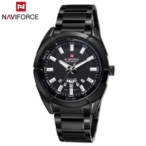 Brand:Naviforce Functional Features: Complete Calendar, Date/Day Display, Polished Stainless steel Alloy Strap, 30M Water Resistant, Hardlex Scratch Resistant Glass. Dial Diameter :44mm Case thickness; 12mm Water Resistance;3ATM/30M Band Material; Stainless steel metallic Gender: Men Clasp Type:Push Button Hidden Clasp