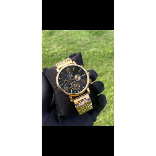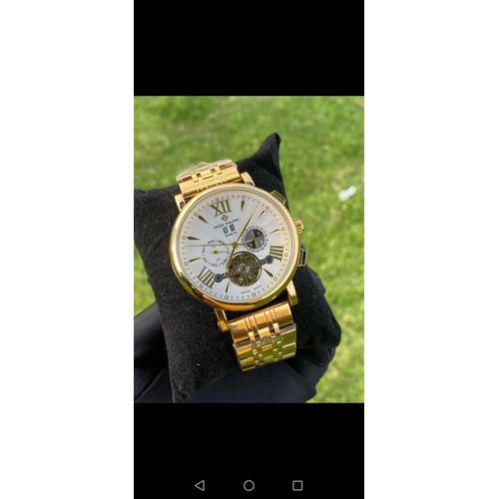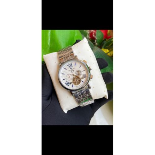 Dial: White textured dial with Roman numeral hour markers Movement: Automatic (self-winding) mechanical movement Case Material: Stainless steel Strap: Stainless steel bracelet with secure clasp Display: Day of the week sub-dial Date sub-dial 24-hour time sub-dial Open-heart window showing internal gears Glass: Scratch-resistant mineral glass Water Resistance: Light splash resistant (not suitable for swimming or diving) Case Size: Approx. 42–44mm (medium-large men’s size) Style: Luxury-inspired, dress watch design